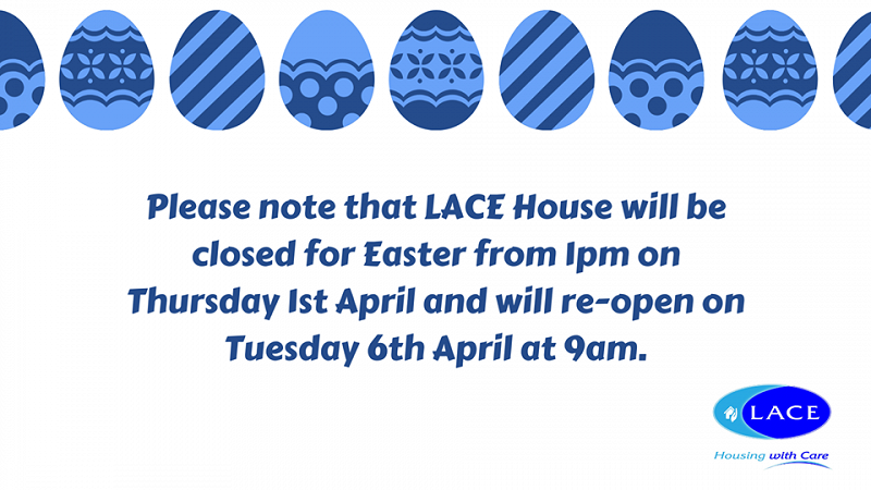 Please note that our main telephone lines at LACE House will be closing for Easter at 1pm today and will re-open at 9am on Tuesday 6th April 2021.
