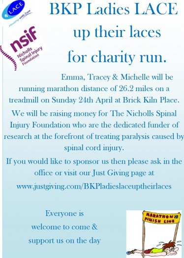 Emma, Tracey & Michelle will be running marathon distance of 26.2 miles on a treadmill on Sunday 24th April at Brick Kiln Place.