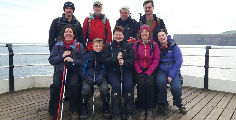 After breakfast we all met at the end of Saltburn Pier for a photo. Although it was sunny, it soon began to rain. We had to climb 666 feet. It was very muddy and Mum and Bob fell in the mud. We arrived in Staithes at lunchtime. Helen, Sara and Mum met three men taking off their wetsuits. We had time to stop for a drink before continuing to Runswick Bay. The sun came out again, although we were all very muddy, apart from Dad. After tea we stayed in a guest house. Our room has a low ceiling and Dad kept banging his head 4 times but there was no damage. Tomorrow will be a long day as we cant leave until the tide is out. We have to walk all the way to Robin Hoods Bay.
