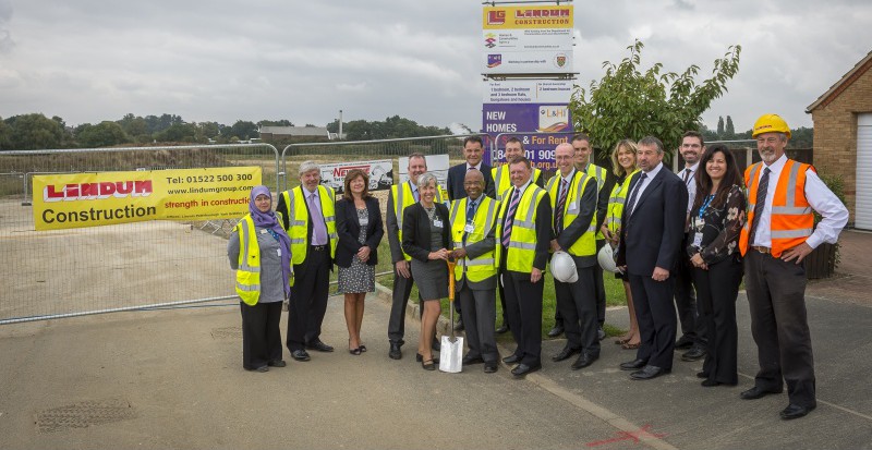 L&H Homes’ chairman, Sidney McFarlane MBE, marked the Start on Site by cutting the soil with Cllr Frances Cartwright, South Kesteven District Council’s Portfolio Holder for Grow the Economy, along with representatives from L&H Homes, Longhurst Group, LACE Housing, South Kesteven District Council, Lindum Construction, and the Homes and Communities Agency (HCA).